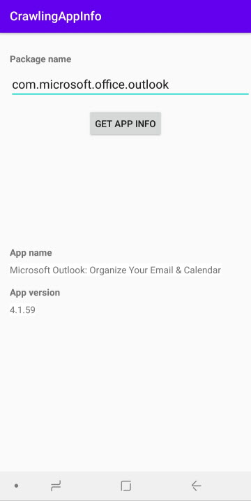 패키지명을 입력하고 버튼을 누르면 Play 스토어에서 크롤링해 온 앱 이름과 버전을 표시해줍니다.
