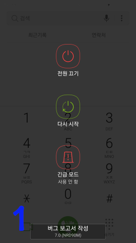 - 이렇게 설정한 상태에서 테스트하다가 오류 등이 발생할 경우 전원(Power)키를 누르면 아래와 하단에 "버그 보고서 작성" 버튼이 나오는데, 눌러주면 Bugreport가 동작합니다. (1)