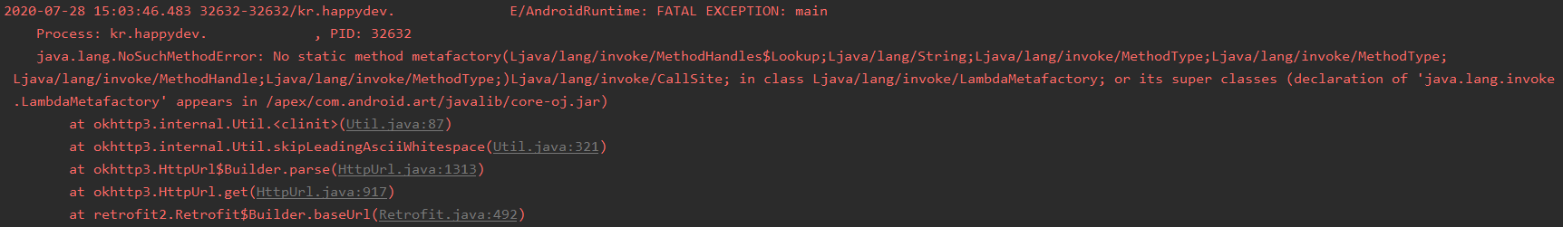 java.lang.NoSuchMethodError: No static method metafactory(Ljava/lang/invoke/MethodHandles$Lookup;Ljava/lang/String;Ljava/lang/invoke/MethodType;Ljava/lang/invoke/MethodType;Ljava/lang/invoke/MethodHandle;Ljava/lang/invoke/MethodType;)Ljava/lang/invoke/CallSite; in class Ljava/lang/invoke/LambdaMetafactory; or its super classes (declaration of java.lang.invoke.LambdaMetafactory' appears in /apex/com.android.art/javalib/core-oj.jar)