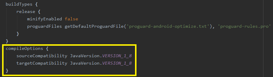 이 런타임오류는 아래 compileOPtions를 build.gradle (app 레벨)에 추가해주면 해결됩니다.