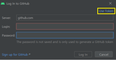 생성된 토큰을 복사해서 안드로이드 스튜디오 깃허브 로그인창의 Use Token 을 클릭합니다.