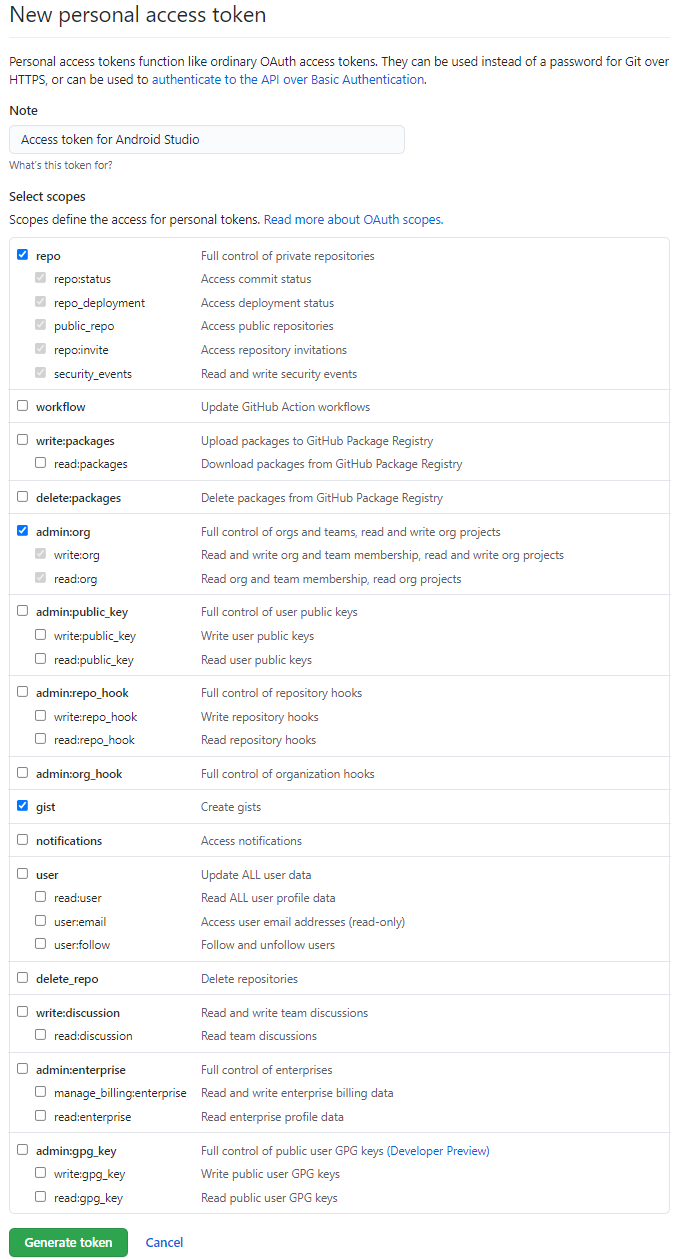 Scopes에서 repo, admin:org, gist를 체크해서 토큰을 발급받습니다. (Generate token 버튼을 클릭)